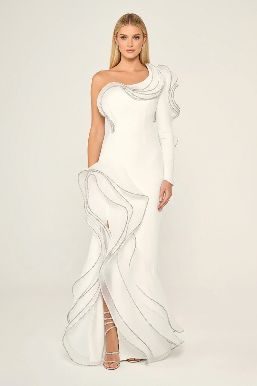 فستان أبيض أنيق بكتف واحد، بتصميم موجات بارزة متدرجة تضيف حركة وفخامة، مع قصّة طويلة وشق أمامي ناعم.