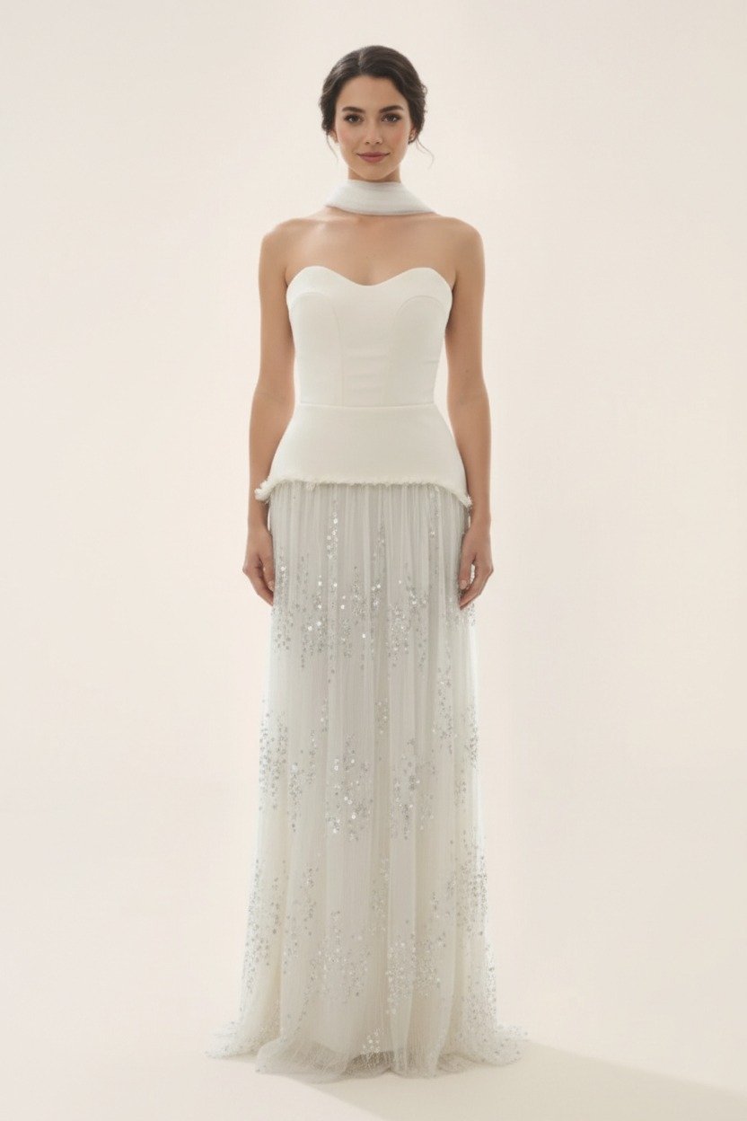 فستان أبيض أنيق سترابليس، بقبّة كورسيه بسيطة وتنورة شيفون طويلة مزينة بلمسات لامعة متدرجة، مع شريط رقبة شفاف يضيف نعومة.