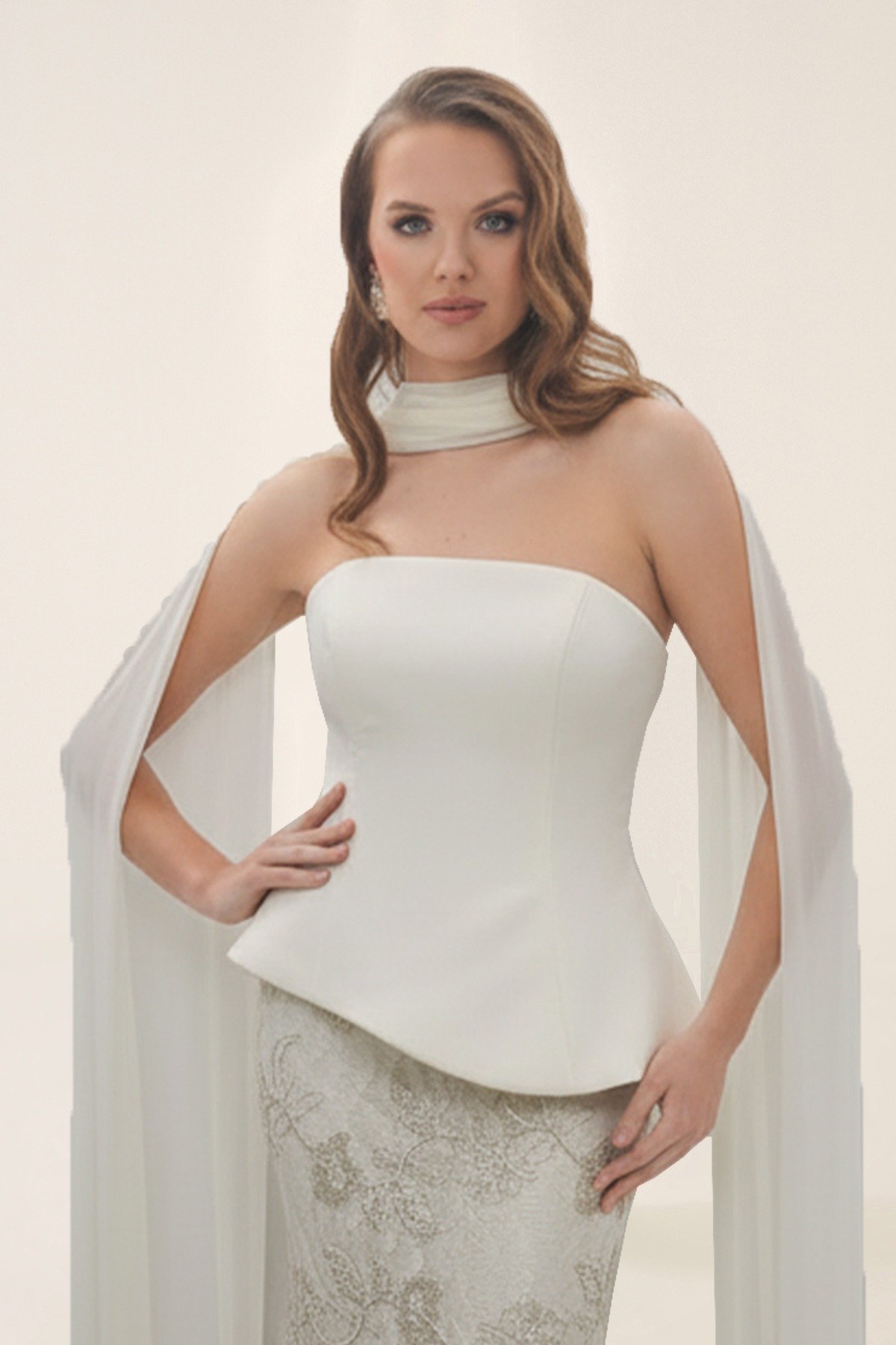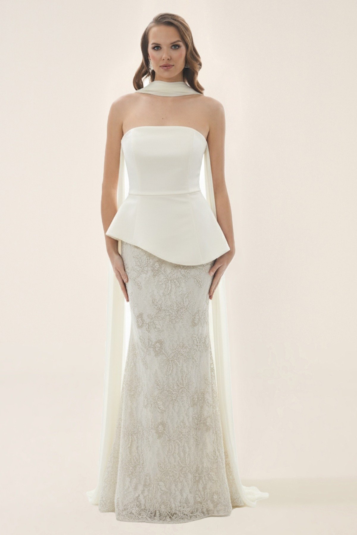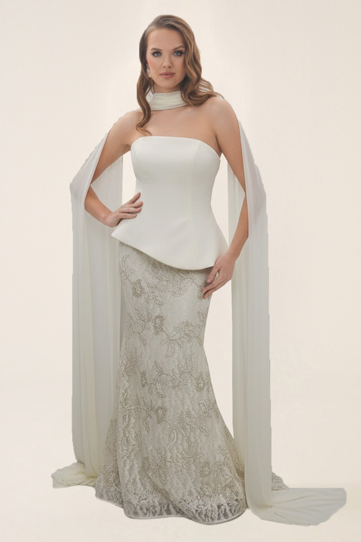 فستان أبيض سترابليس بقصّة بيبلوم أنيقة، وتنورة دانتيل طويلة بنقش ناعم مع شال رقبة خفيف يضيف لمسة راقية.