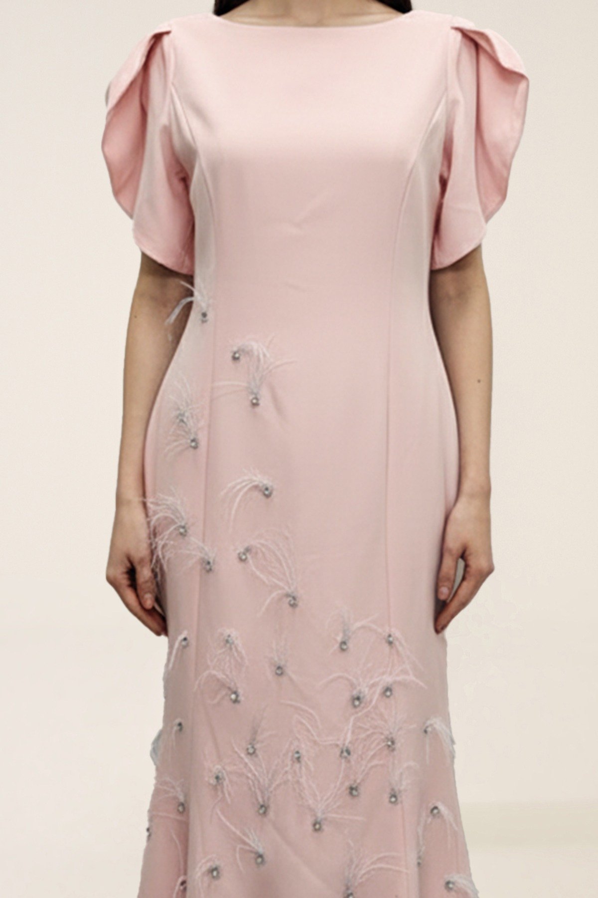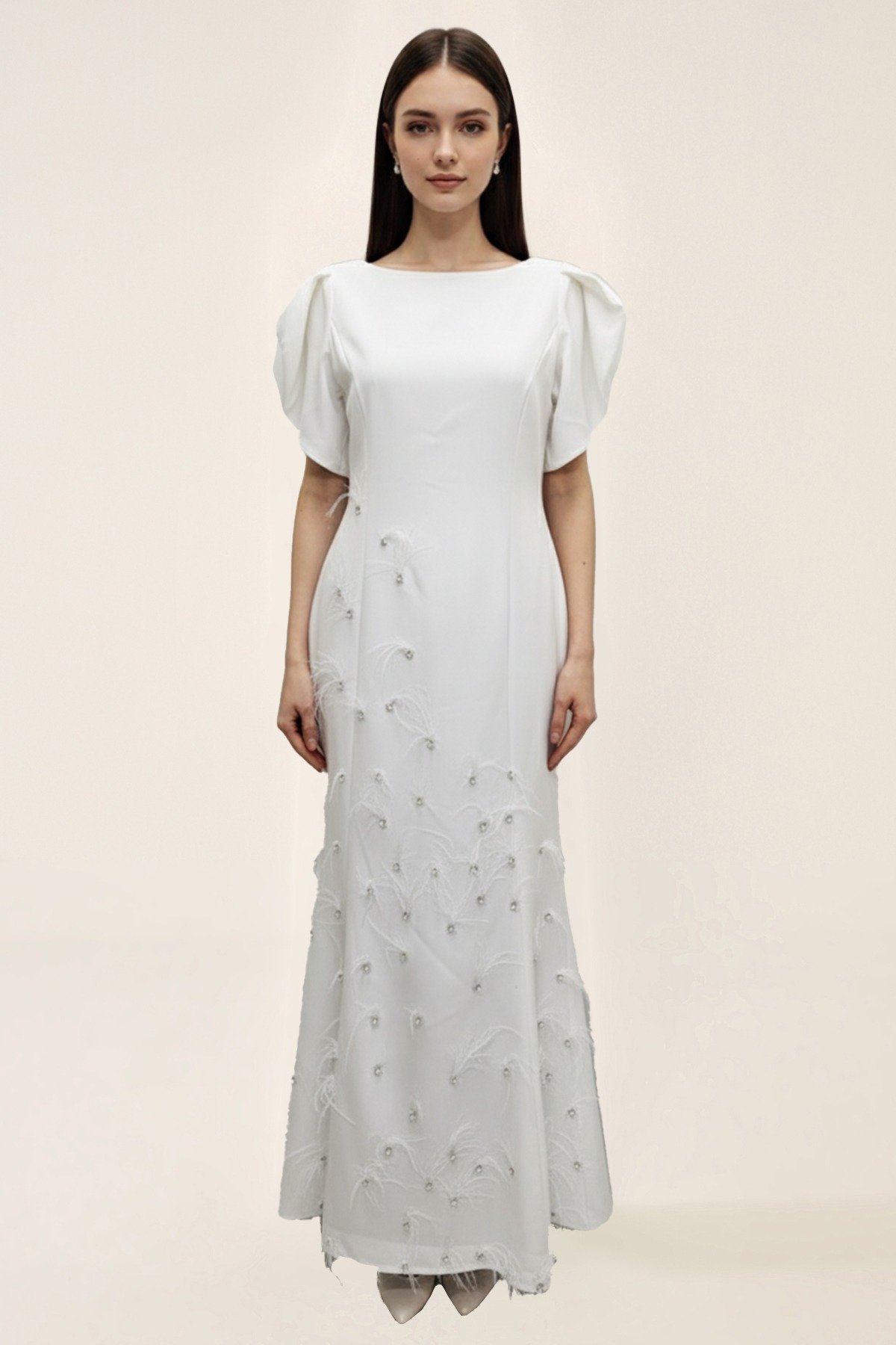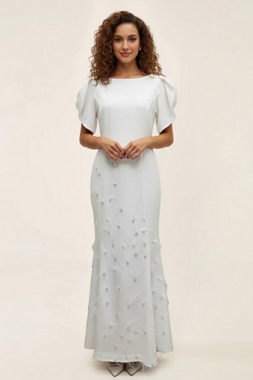 فستان أبيض ناعم بأكمام منفوخة قصيرة وقصّة مستقيمة، مزين بتطريز ناعم وخرز متناثر في الجزء السفلي لإطلالة راقية وبسيطة.