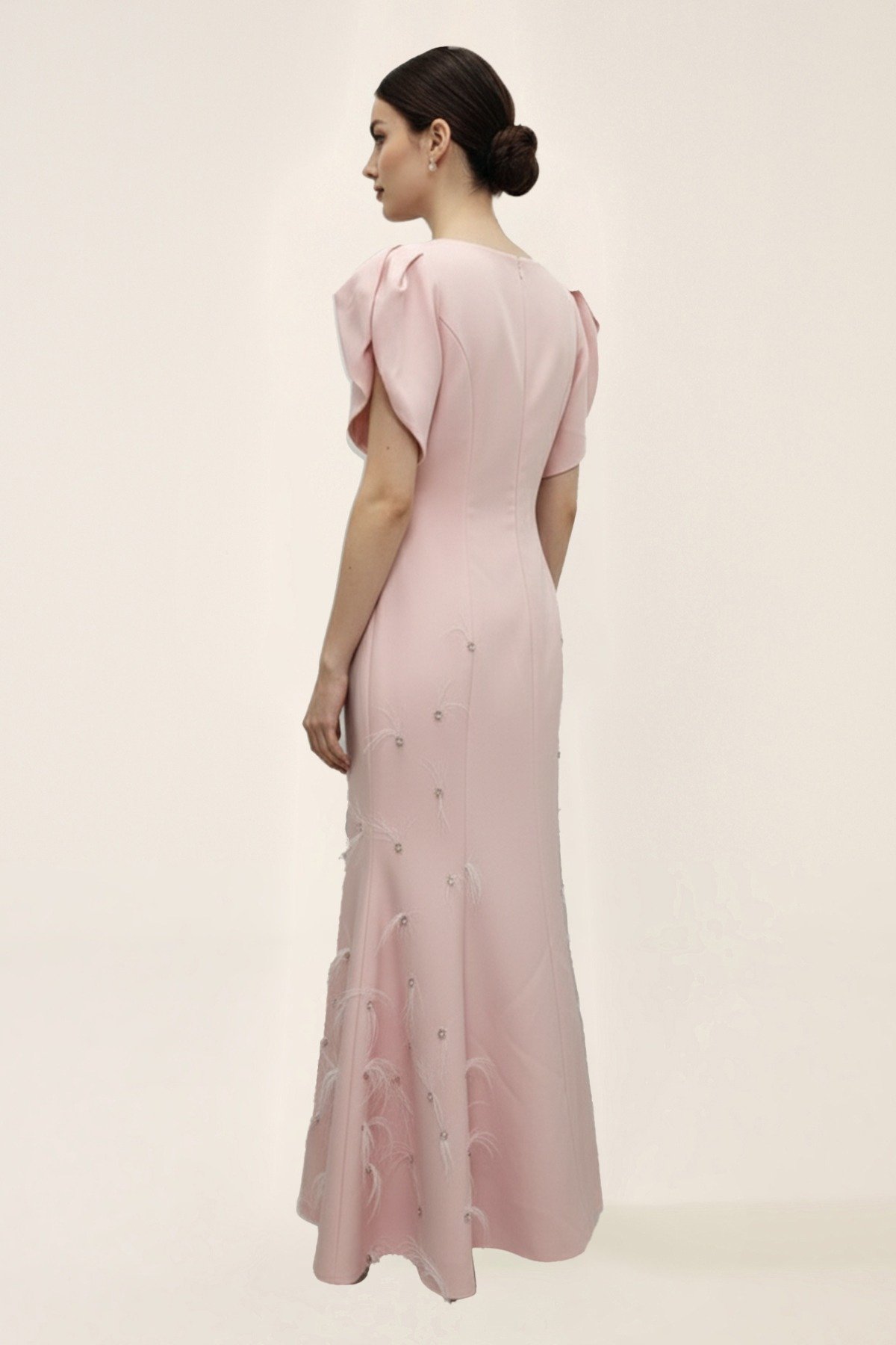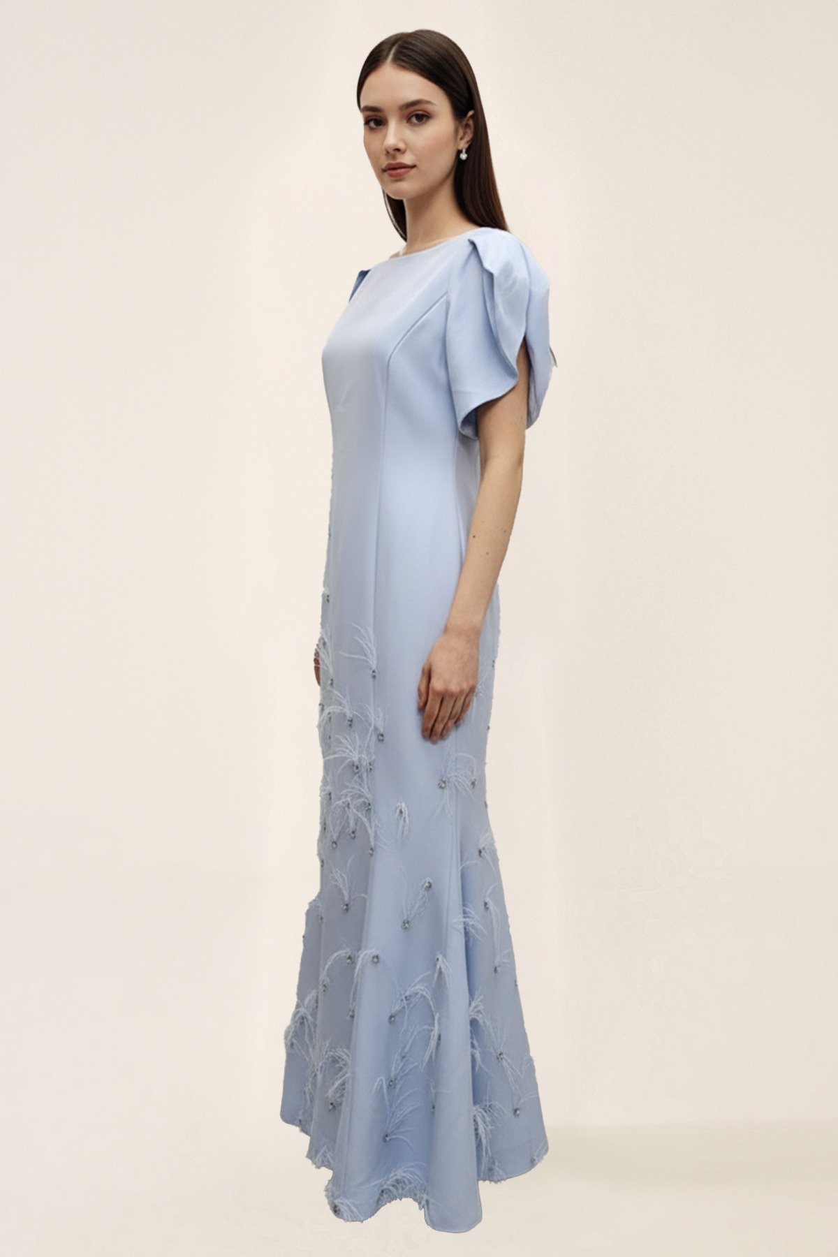 التصميم يبرز جمال الأكمام المنفوخة ويمنح الحضور لمسة كلاسيكية راقية تناسب ذوق المرأة العصرية الباحثة عن توازن بين البساطة والفخامة. يمكن تنسيق الفستان مع حذاء بكعب عالي وأكسسوارات بسيطة لإكمال الإطلالة، مما يجعله خيارًا ممتازًا لحفلات الزفاف، العشاء الراقية، أو الأمسيات الخاصة.