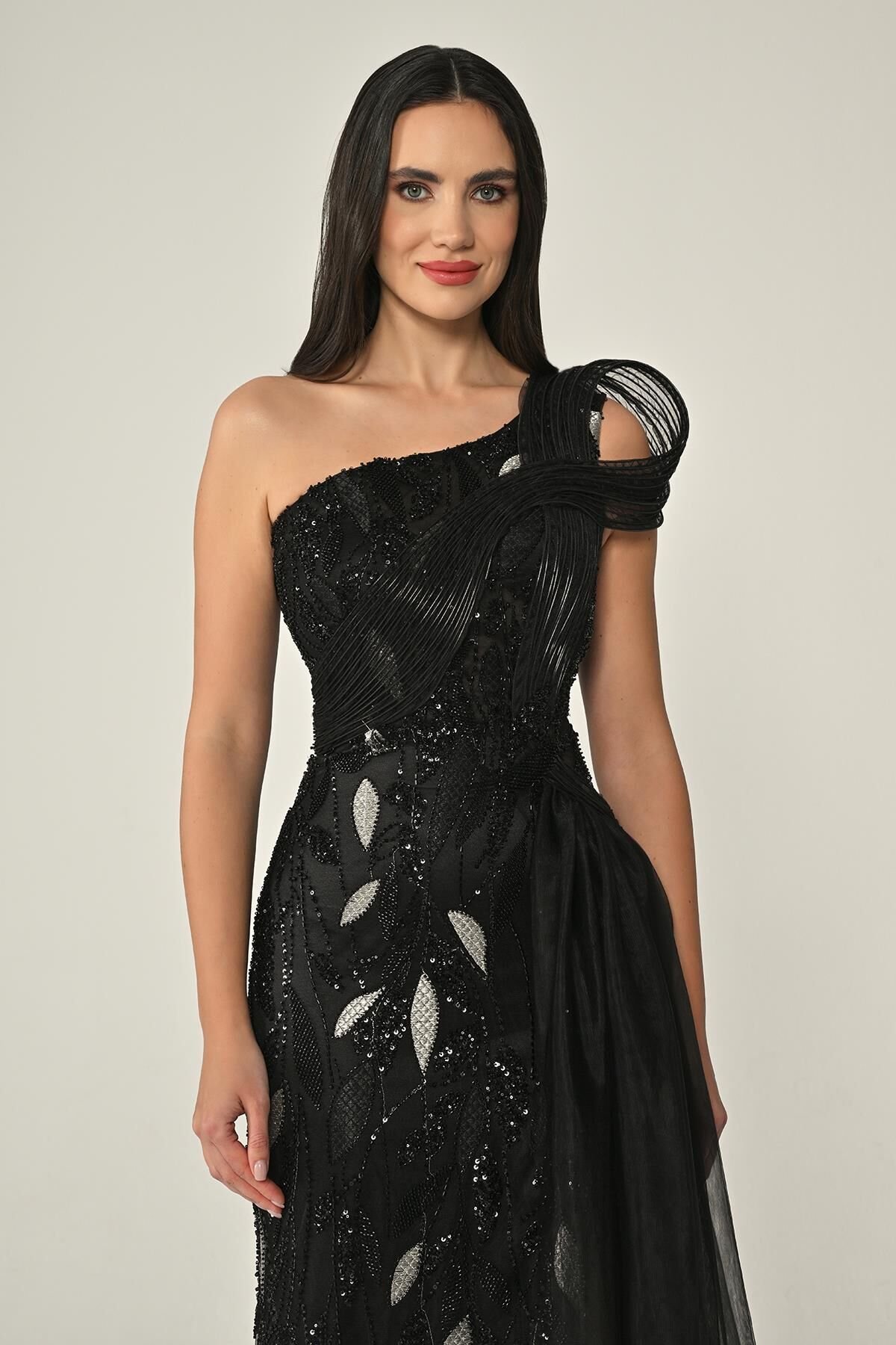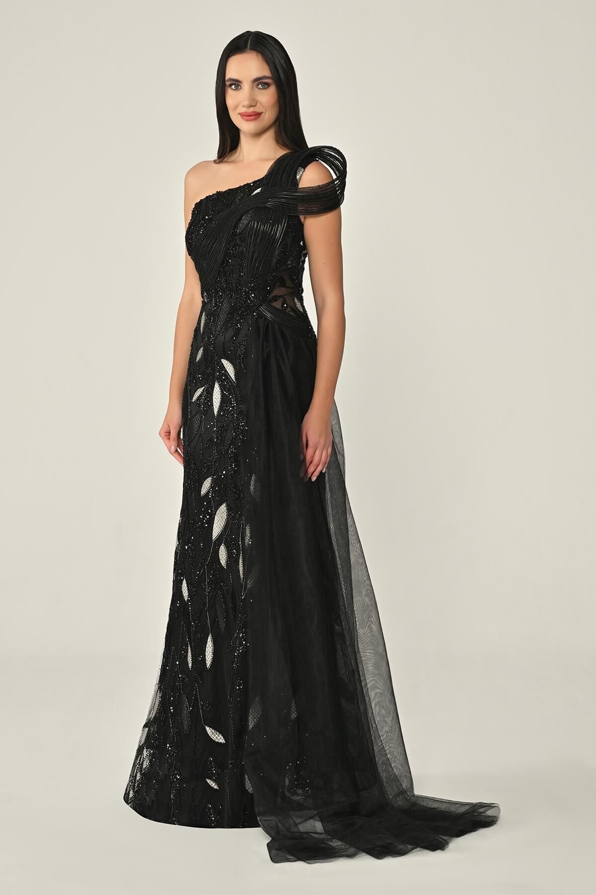فستان أزرق سماوي فاخر بتصميم كتف واحد، مزيّن بتطريزات لامعة على شكل أوراق تمتد على كامل الفستان. الجزء العلوي يأتي بخطوط ثلاثية الأبعاد منسابة تمنح لمسة فنية مميّزة، مع شق جانبي طويل وشال تول خفيف يضفي أناقة وانسيابية راقية.