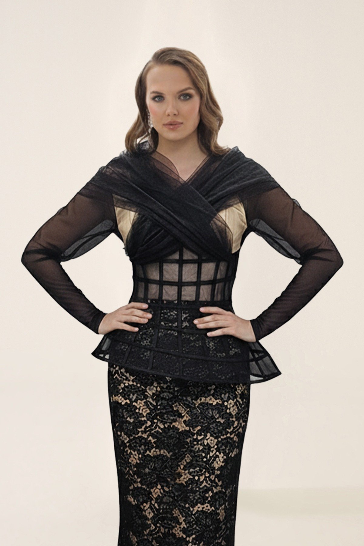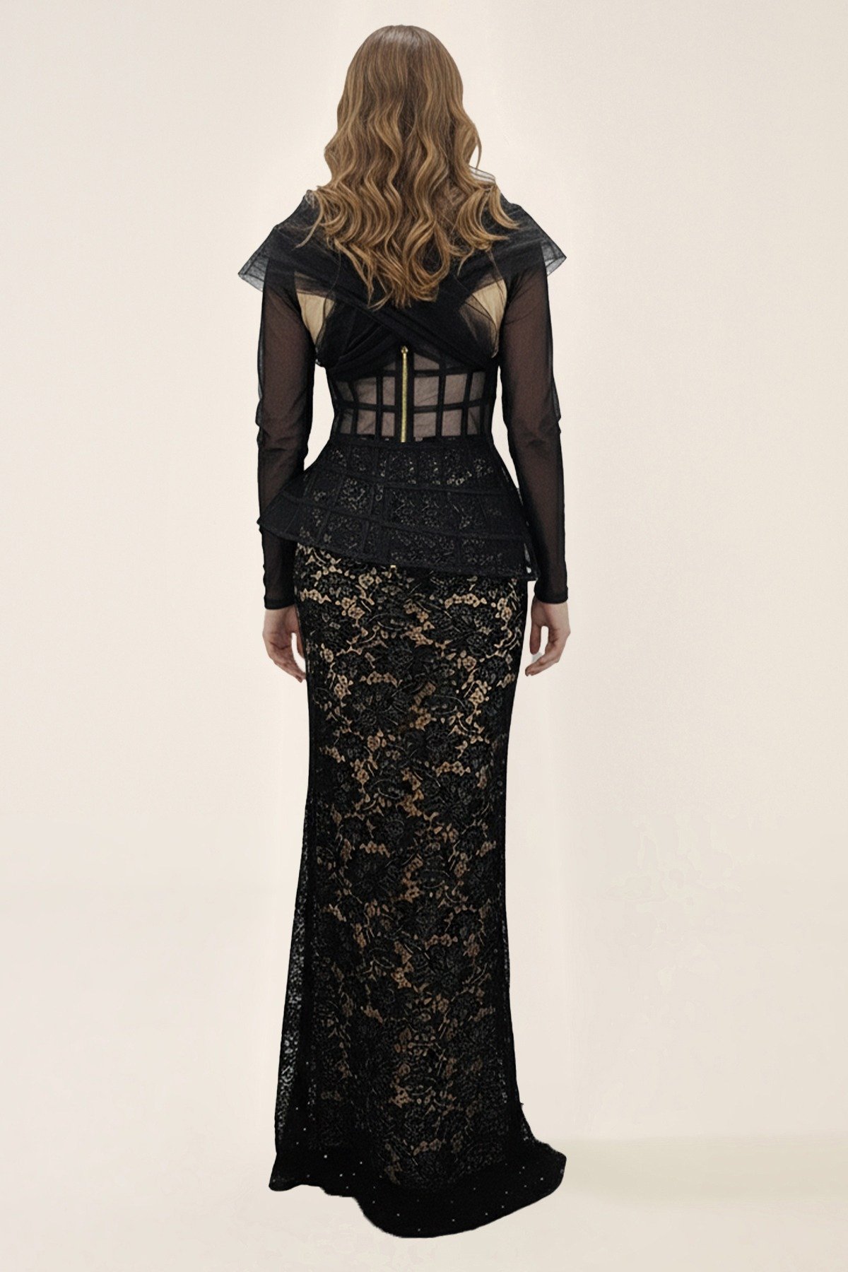 فستان أسود بتصميم جريء وفاخر، يجمع بين التول الشفاف والدانتيل.