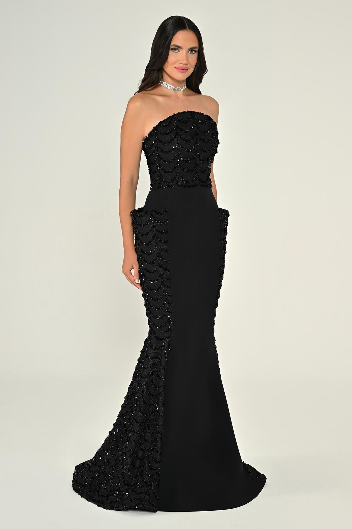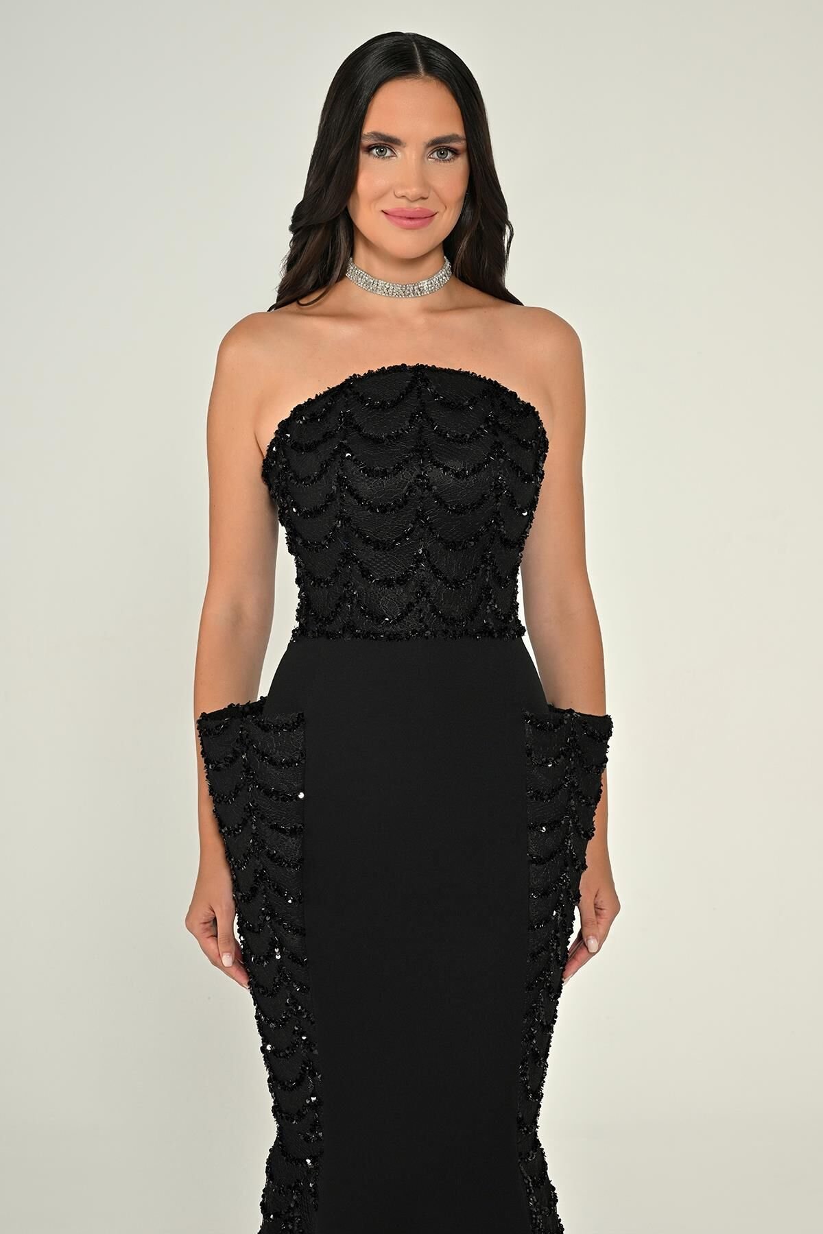 فستان أسود بقصّة حورية بدون أكمام، الجزء العلوي مزيّن بالترتر اللامع بتصميم مقوّس، مع امتداد نفس التطريز على الجانبين حتى أسفل الفستان، ليعطي إطلالة فاخرة ومحدّدة للقوام.