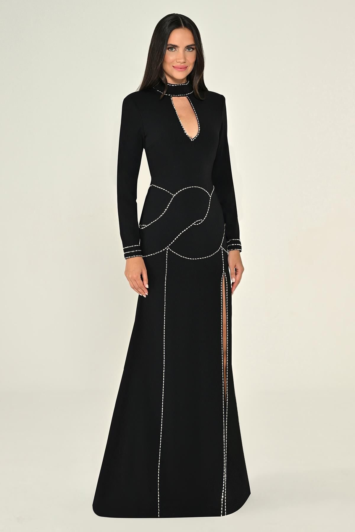 تمنح الأكمام الطويلة إحساسًا بالدفء والرقي، بينما تبرز الياقة العالية لمسة كلاسيكية تضيف تميزًا في كل حركة. يمكن تنسيق الفستان مع حذاء بكعب عالٍ وأكسسوارات معدنية ناعمة لإكمال الإطلالة بأناقة متكاملة تلفت الأنظار في كل مناسبة.