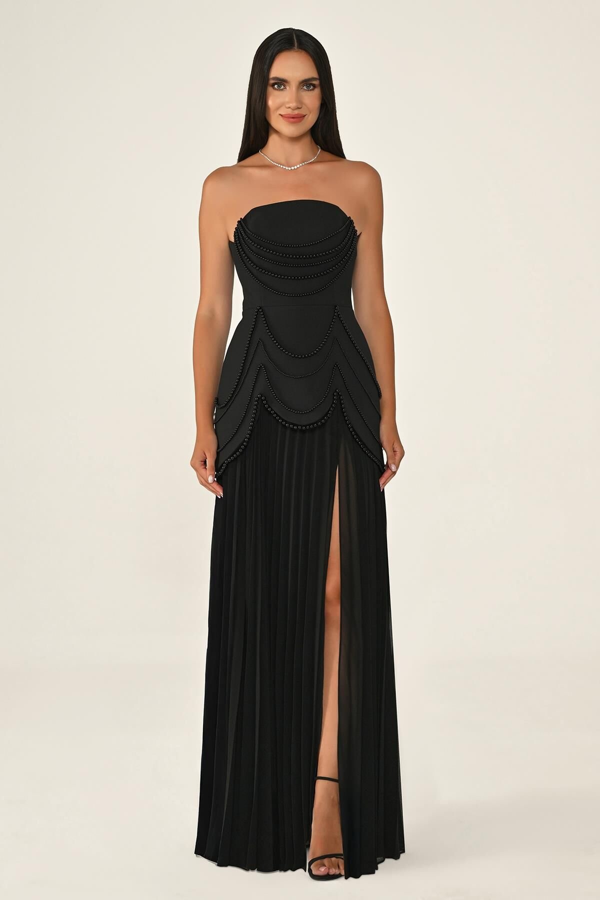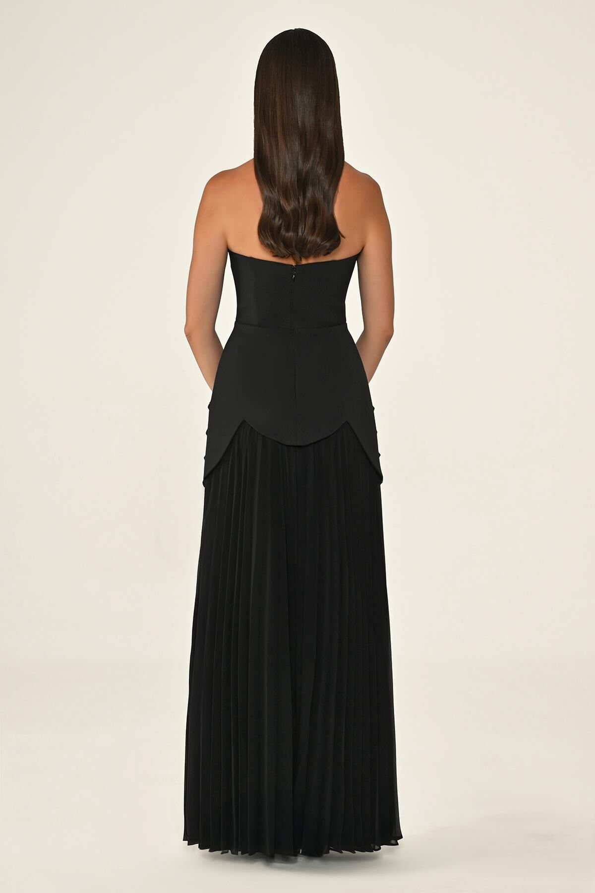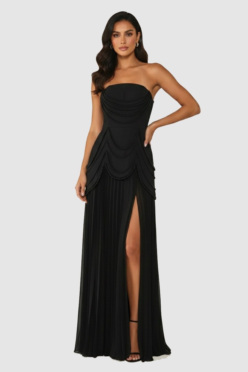 فستان أسود سترابليس بتفاصيل طبقات مزينة على الكورسيه، وتنورة بليسيه طويلة مع شق أمامي أنيق.
