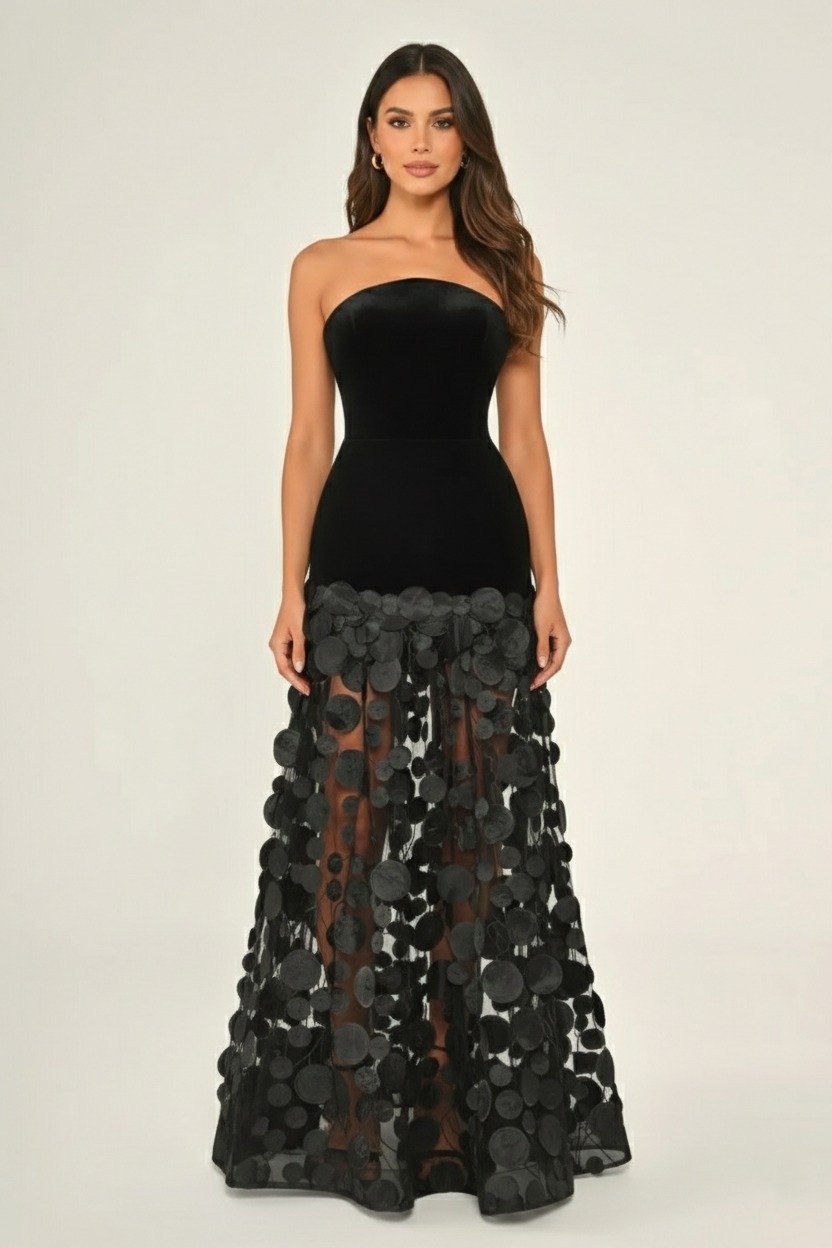 فستان أسود مخملي بدون أكمام، بقصّة ضيقة على الجسم من الأعلى. تتميز تنورته الشفافة بتطريز دوائر ثلاثية الأبعاد تمنح الفستان حركة فنية ولمسة فاخرة وجذابة.