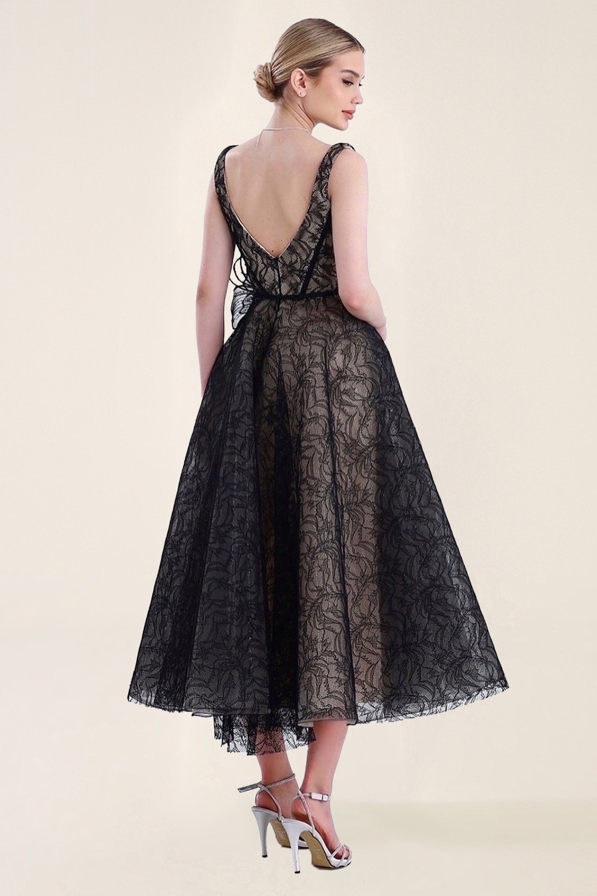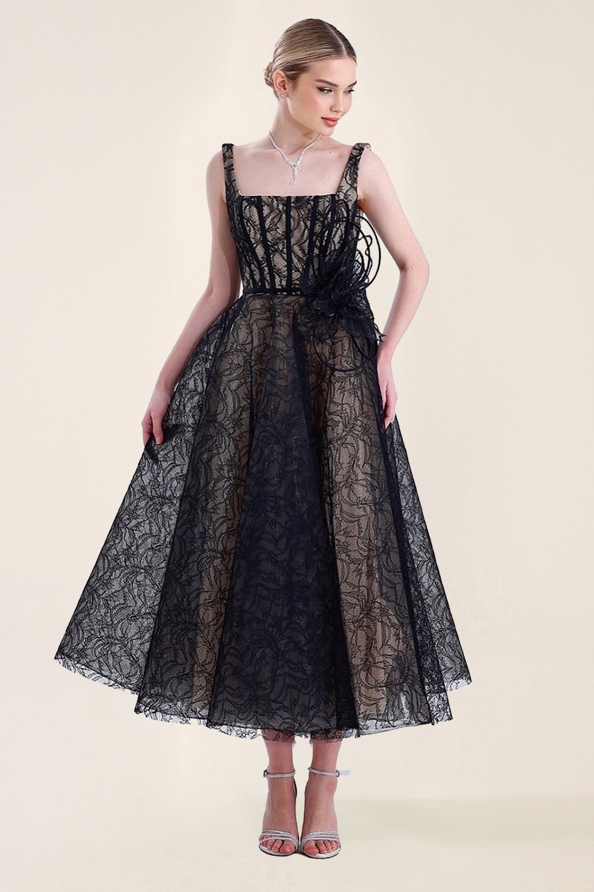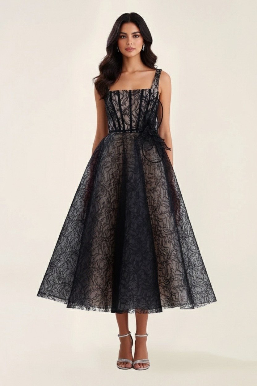 فستان أسود ميدي بقماش دانتيل فوق بطانة بيج، بربطات كتف رفيعة وكورسيه محدد وتنورة منفوشة لإطلالة كلاسيكية أنيقة.