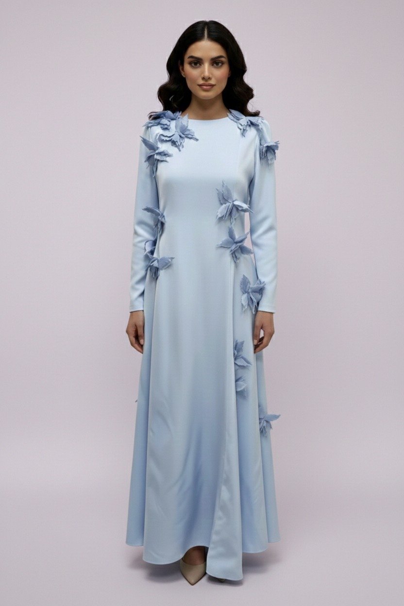 فستان بأكمام طويلة وقصّة بسيطة، مزدان بفيونكات ثلاثية الأبعاد موزعة على الكتف والجوانب لإضافة لمسة ناعمة ومميزة.