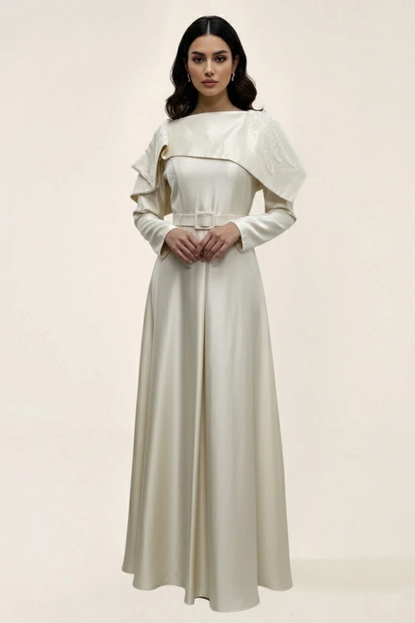 فستان أوف وايت بأكمام طويلة وقماش لامع، يتميّز بكتف عريض بطبقة علوية فاخرة وحزام يحدد الخصر، مع قصّة طويلة وانسيابية.