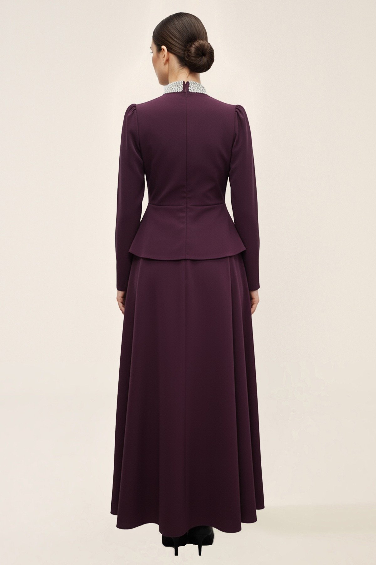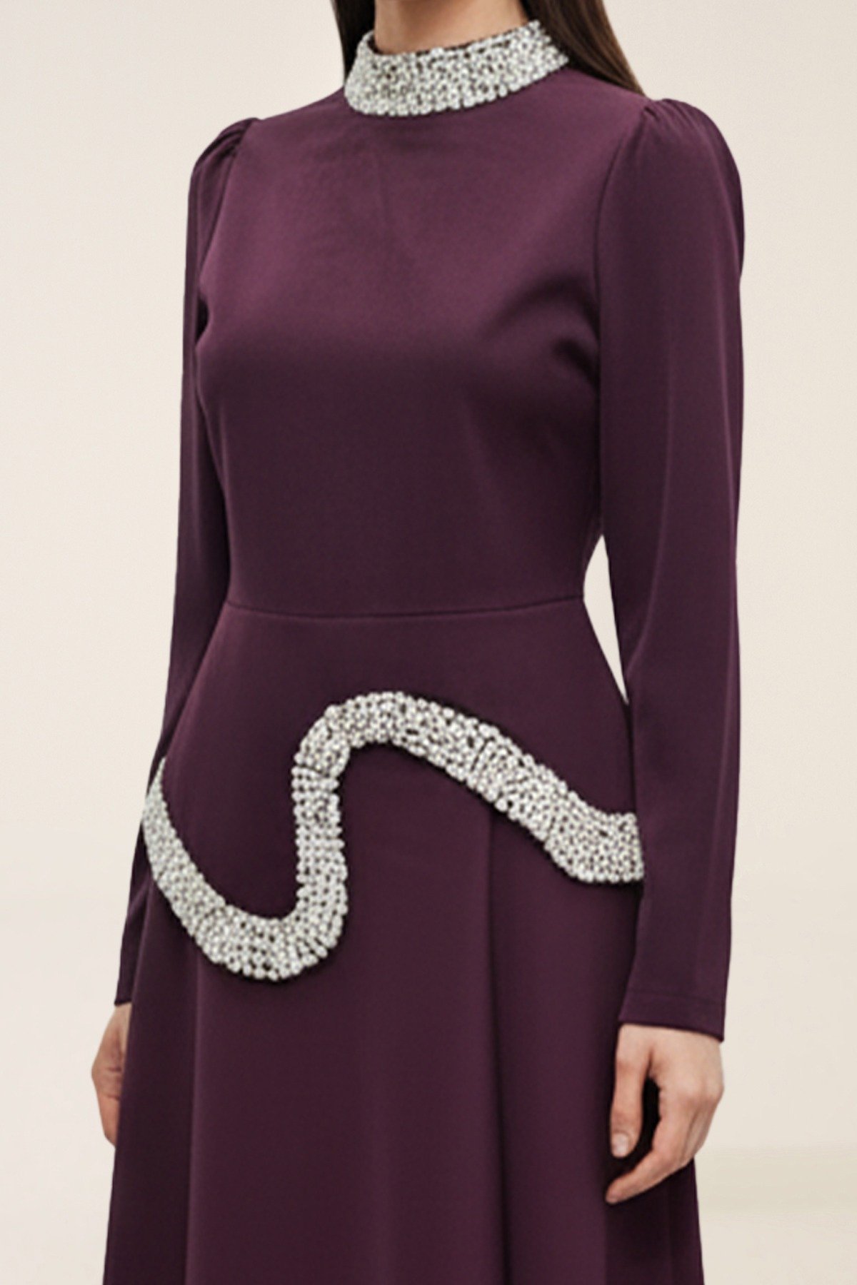 فستان أخضر داكن بأكمام طويلة وياقة مطرزة، يتميز بتفصيل مموج على الخصر مزين بالخرز، مع تنورة واسعة وانسيابية.