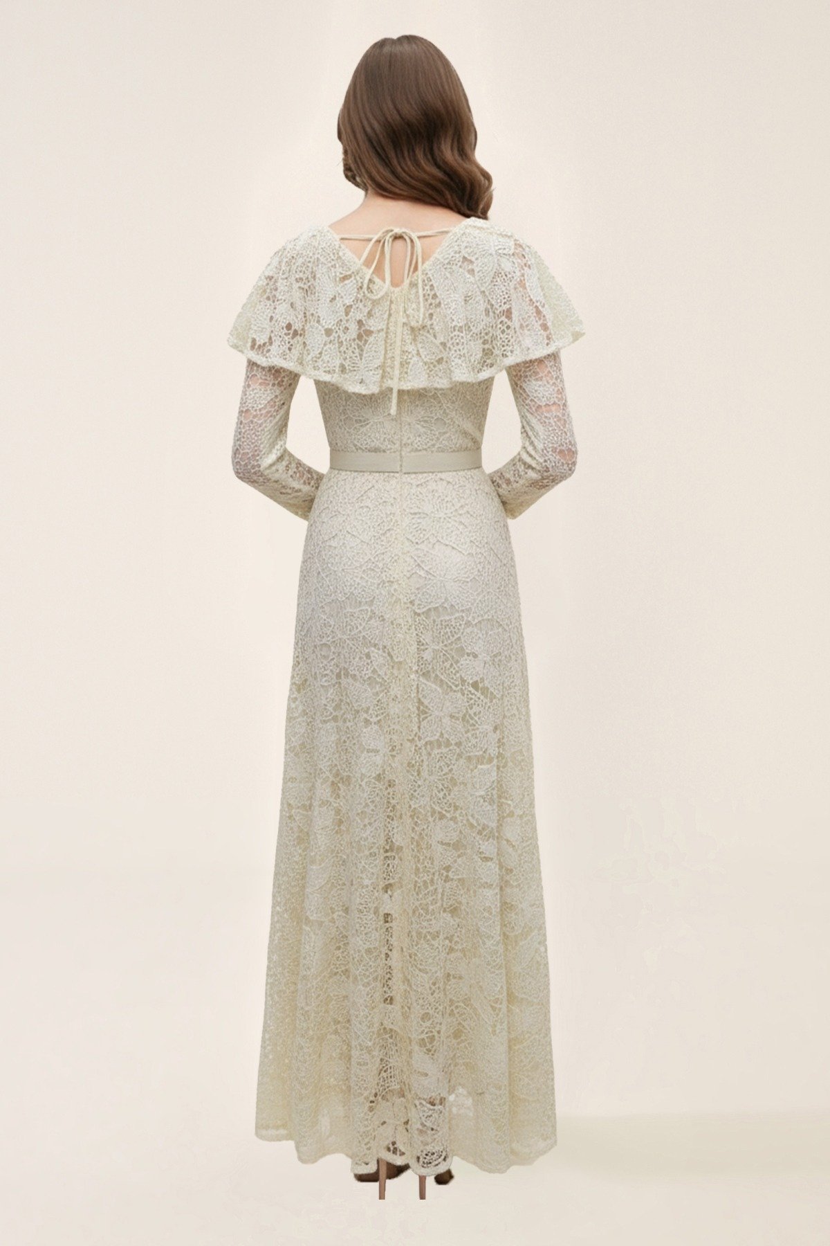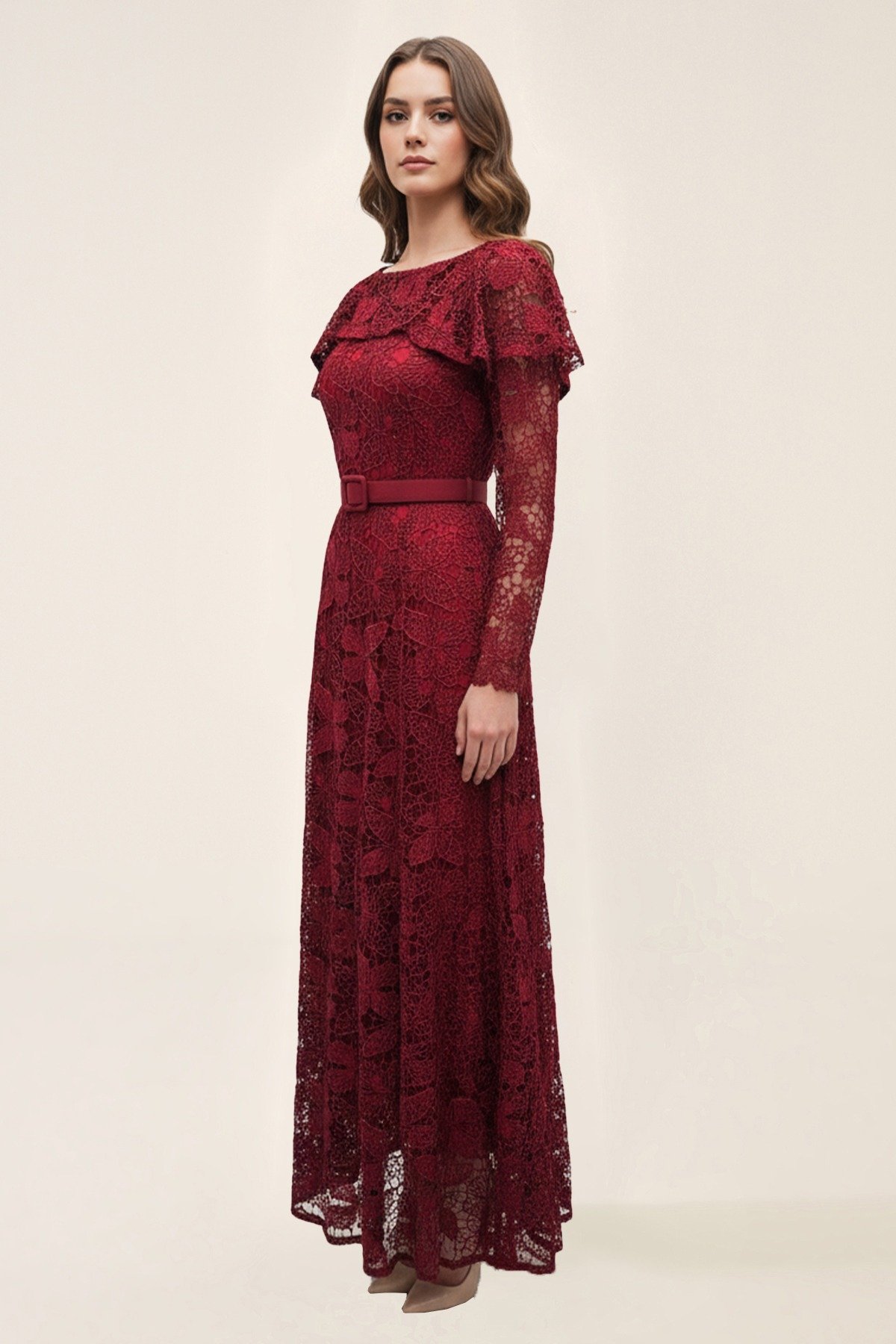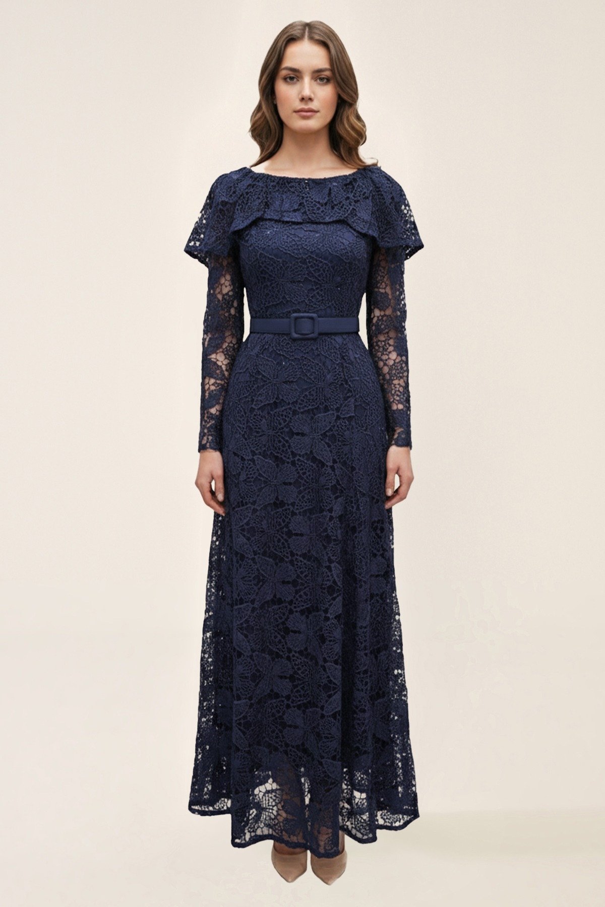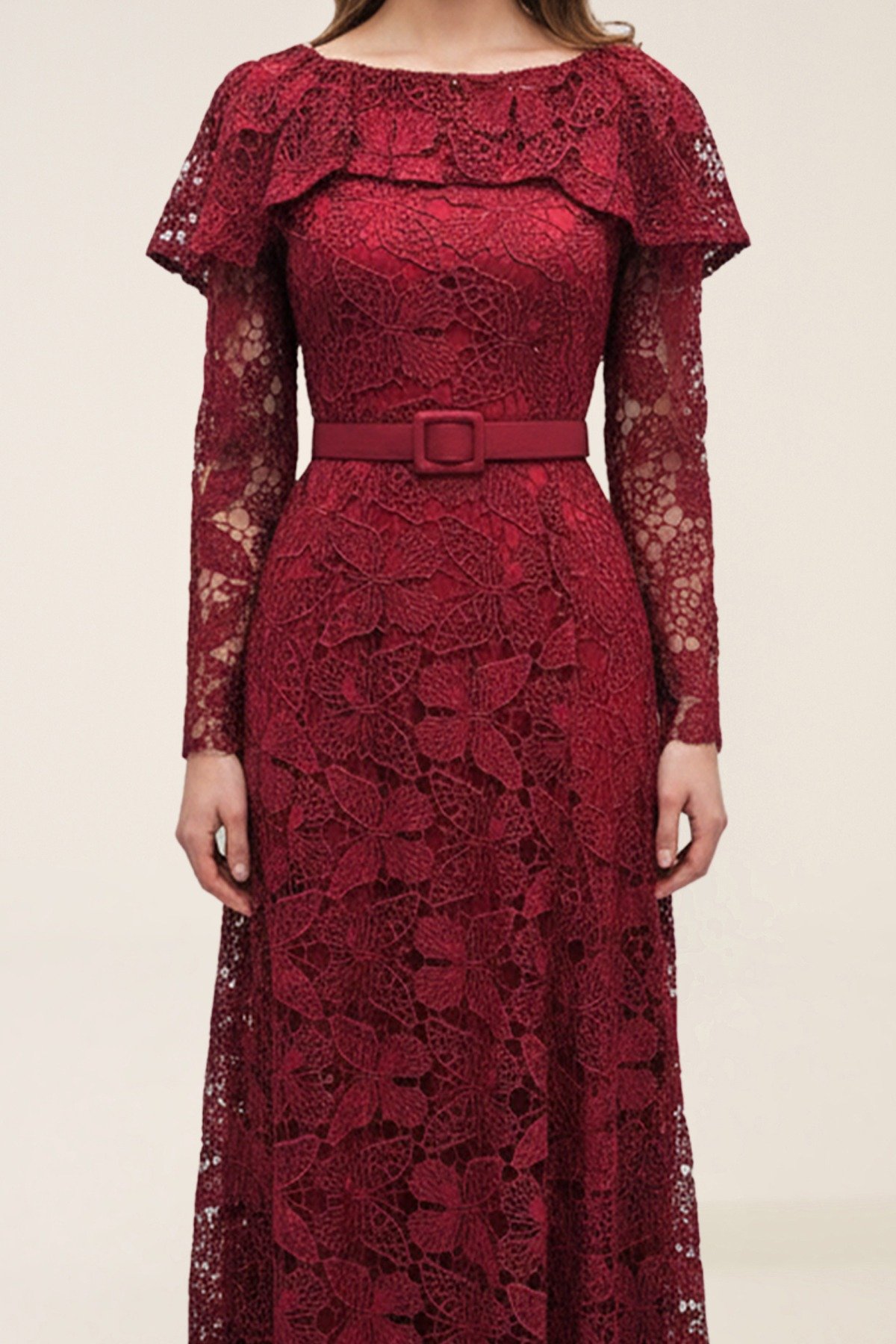 فستان دانتيل بأكمام طويلة، ياقة مزينة بطبقات ناعمة وحزام يحدد الخصر، مع تنورة انسيابية بطول متوسط