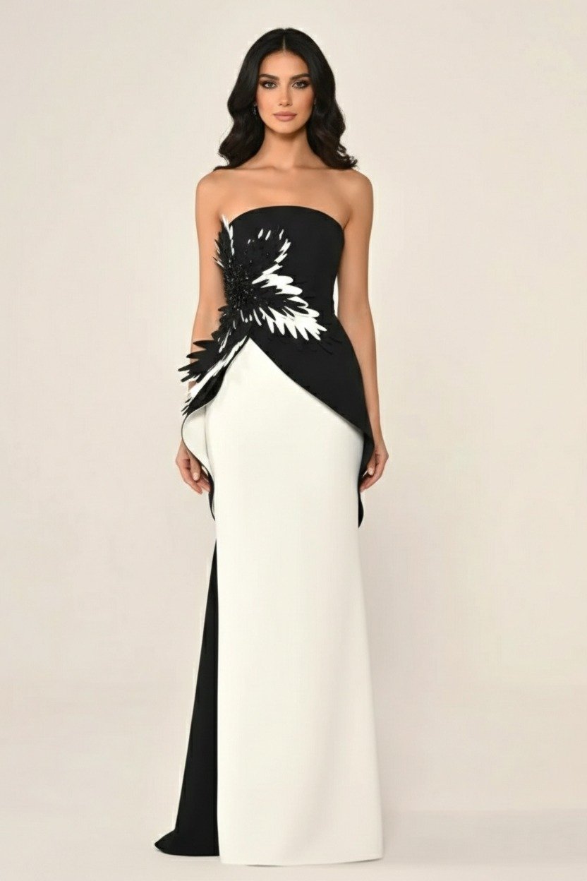 فستان سهرة أنيق بالأسود والأبيض، سترابليس، مع زهرة بارزة على الخصر وقصّة طويلة مستقيمة بتفاصيل جانبية ناعمة.