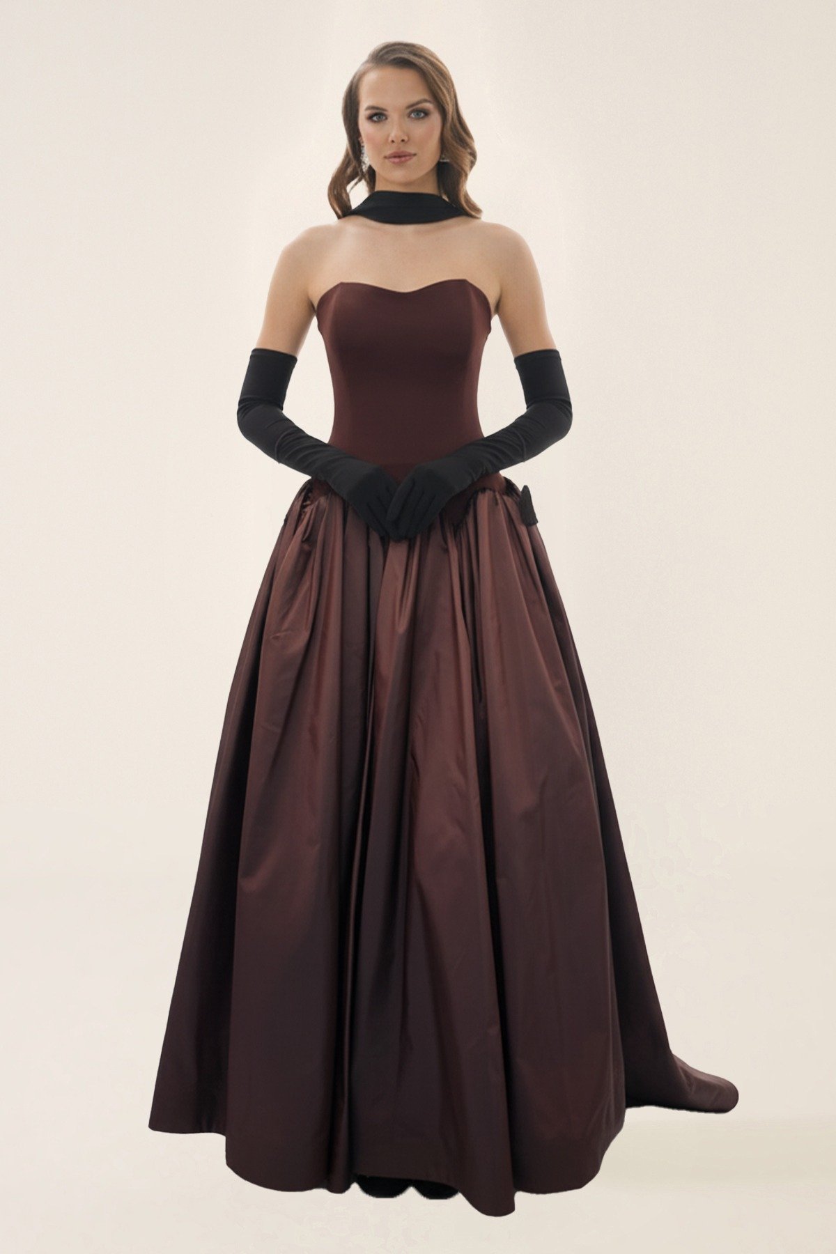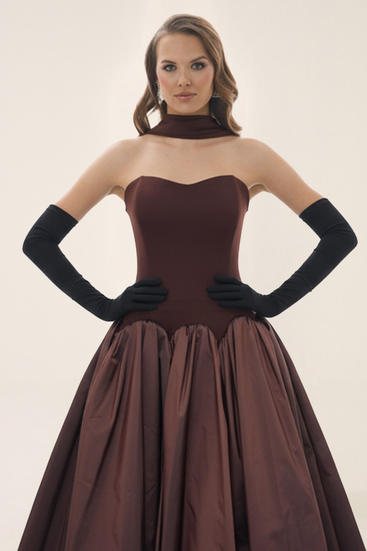 فستان سهره بقصّة كلاسيكية باللون البني، كورسيه بدون أكمام وتنورة منفوشة واسعة، مع قفازات وإضافة شريط أسود للرقبة بتفاصيل راقية.