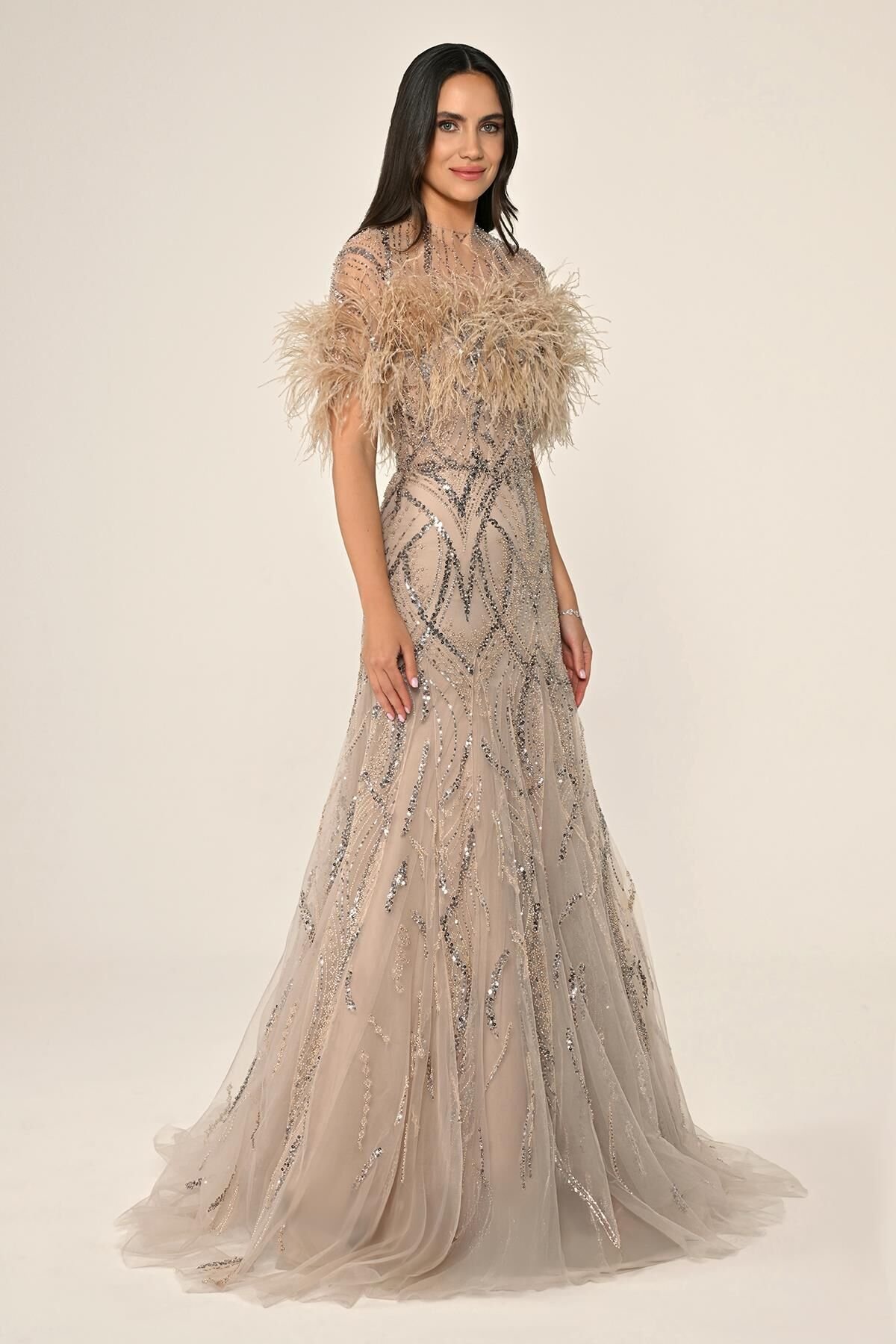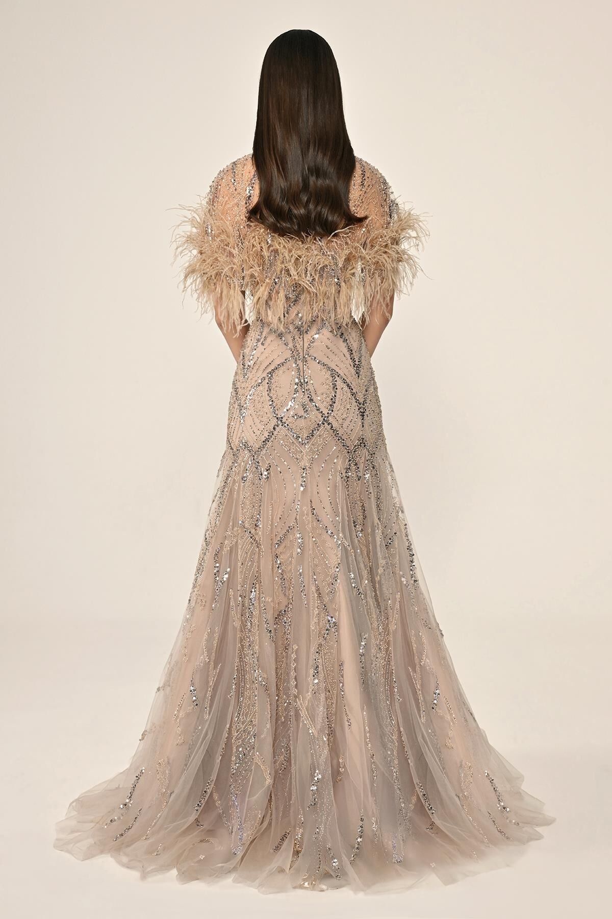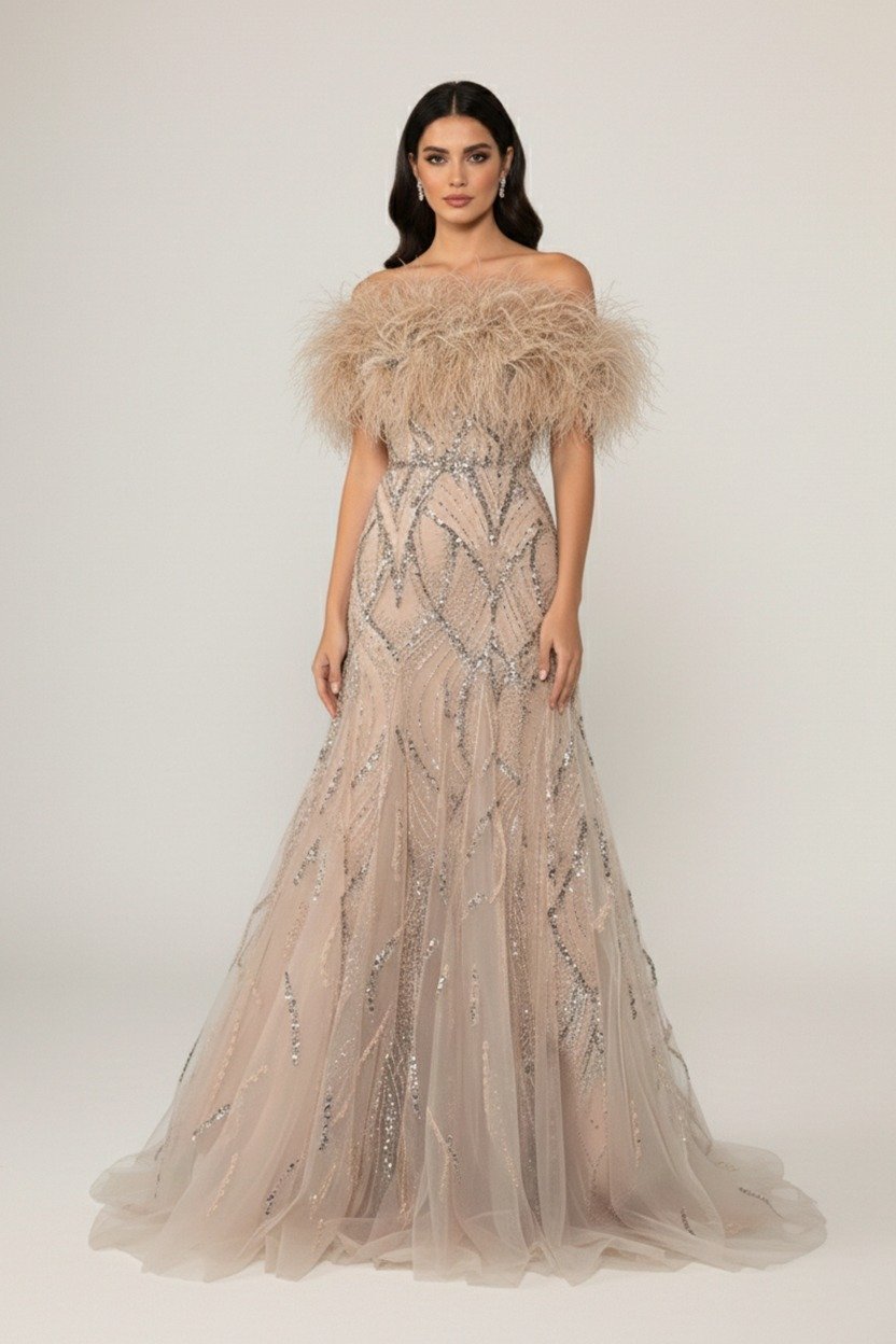 فستان شامبين فاخر بقصّة منفوشة ناعمة، مغطّى بتطريزات لامعة بتصاميم هندسية راقية. يتميّز بقطعة علوية من الريش الفاخر التي تضيف حجماً وأناقة، مع تول ناعم يمنح الفستان لمسة ملكية ساحرة.
