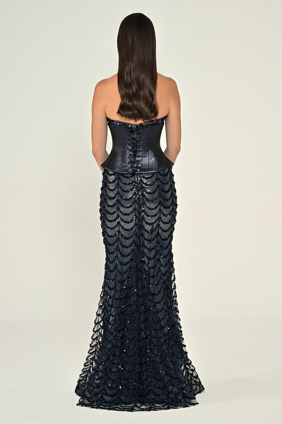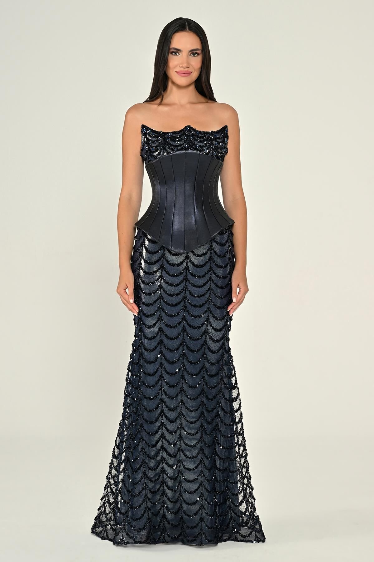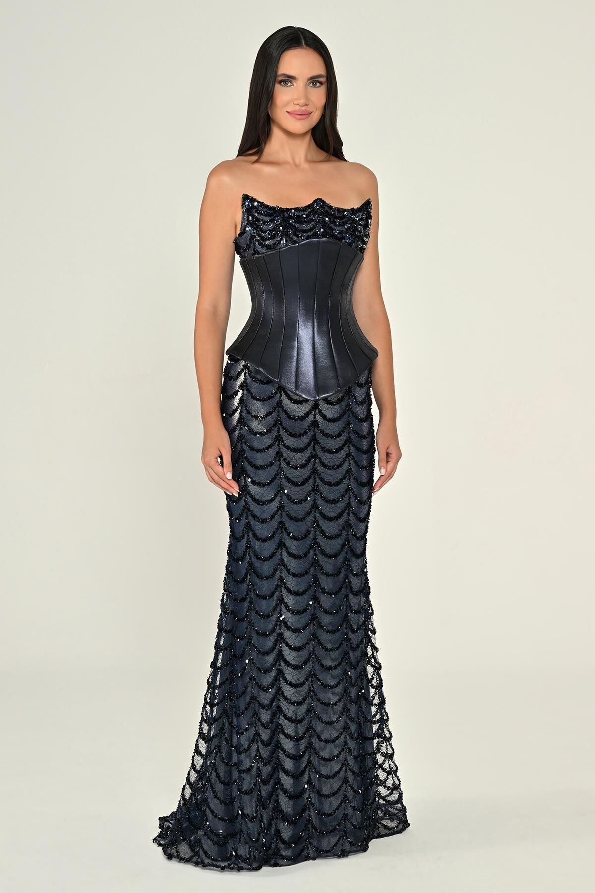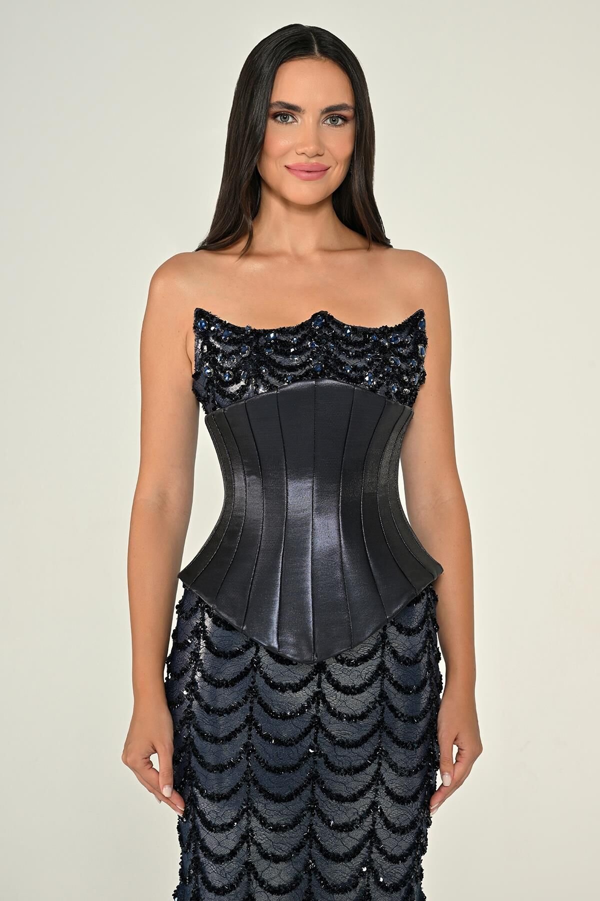 فستان كحلي فاخر بدون أكمام بتصميم كورسيه بارز يمنح خصرًا محددًا. الجزء العلوي مزيّن بترتر لامع، بينما تأتي التنورة بقماش مُطرّز على شكل طبقات مقوّسة تضيف حركة ولمعة راقية لإطلالة مميّزة