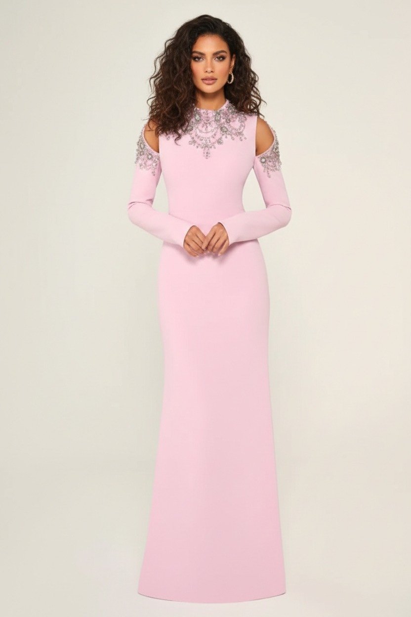 فستان وردي أنيق بقصة مستقيمة، أكتاف مفتوحة وتطريز لامع على الصدر والأكتاف، مع أكمام طويلة بتفصيل ناعم.